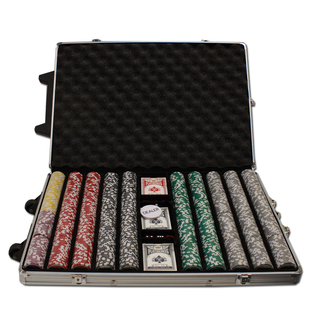 This is the 1000 piece Eclipse 14 gram poker chip set with a rolling aluminum case. This set includes 1000 of the clay-composite Eclipse poker chips, a dealer button, 6 dice and 3 decks of playing cards .
