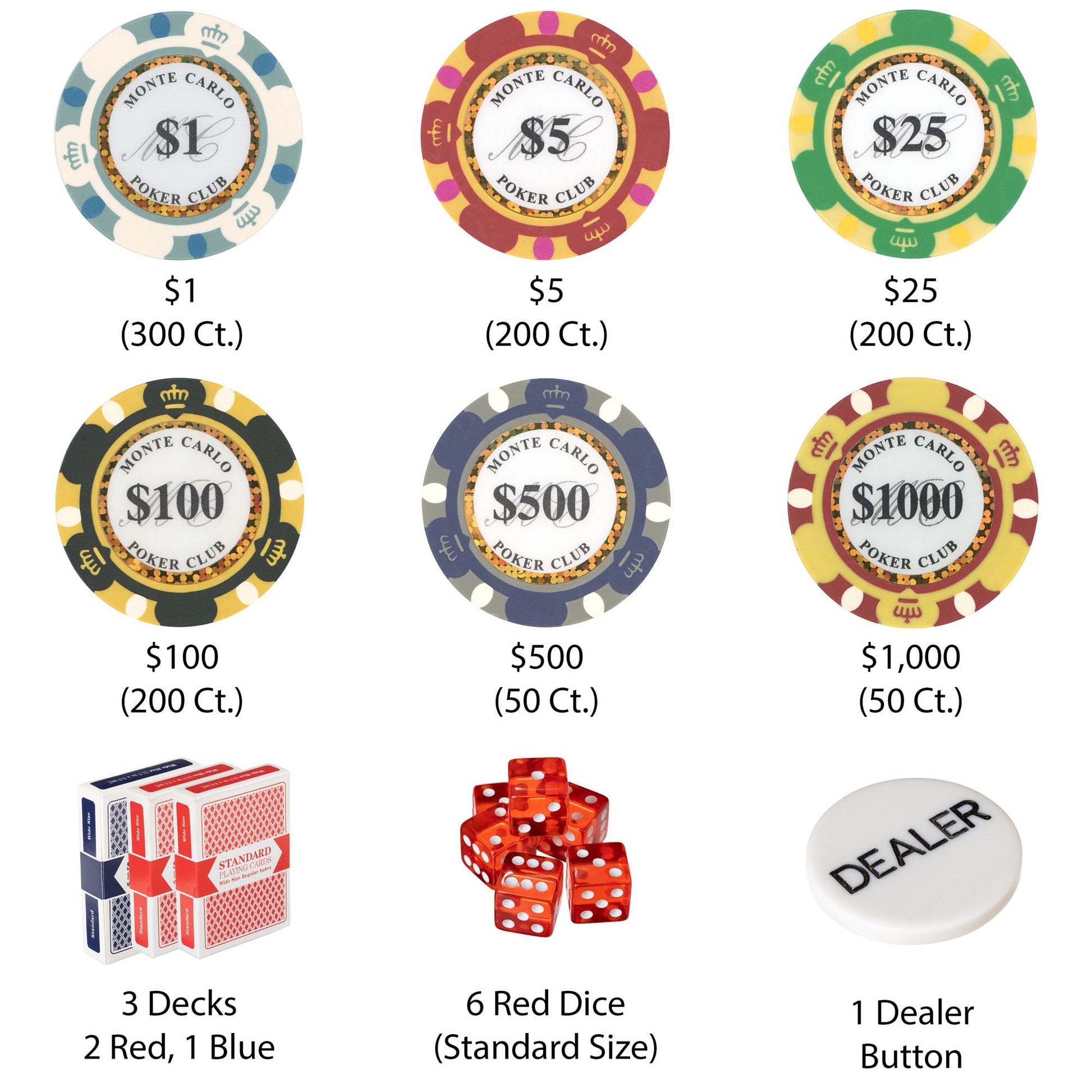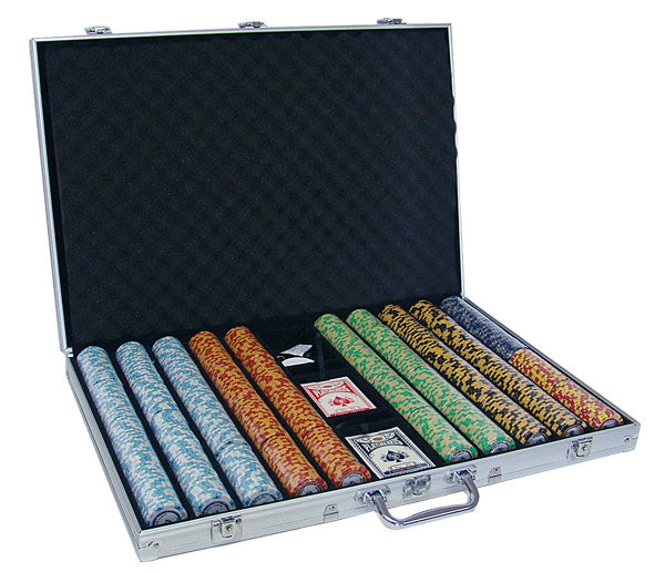 This is the 1000 piece Monte Carlo 14 gram poker chip set with an aluminum case. This set includes 1000 of the clay-composite Monte Carlo poker chips, a dealer button, 5 dice and 3 decks of playing cards .