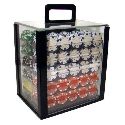 This is the 1000 piece Striped Dice 11.5 gram poker chip set with an acrylic carrier. This set includes 1000 of the clay-composite Striped Dice poker chips and ten acrylic chip trays.