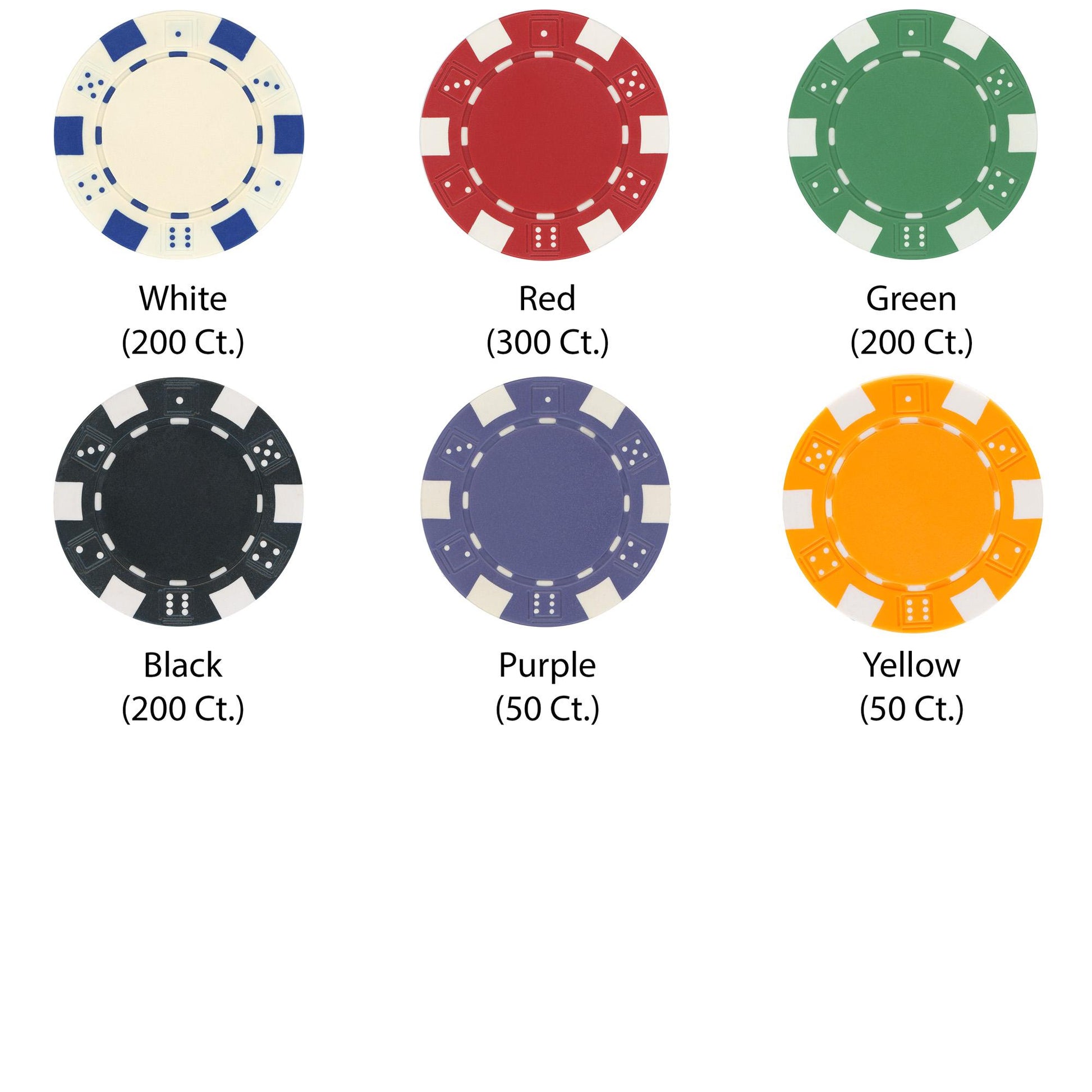 In this set you get 200 white chips, 300 red chips, 200 green chips, 200 black chips, 50 purple chips, and 50 orange chips.