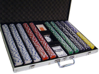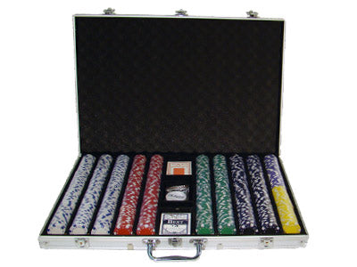 This is the 1000 piece Striped Dice 11.5 gram poker chip set with an aluminum case. This set includes 1000 of the clay-composite Striped Dice poker chips, a dealer button, 5 dice and 3 decks of playing cards .