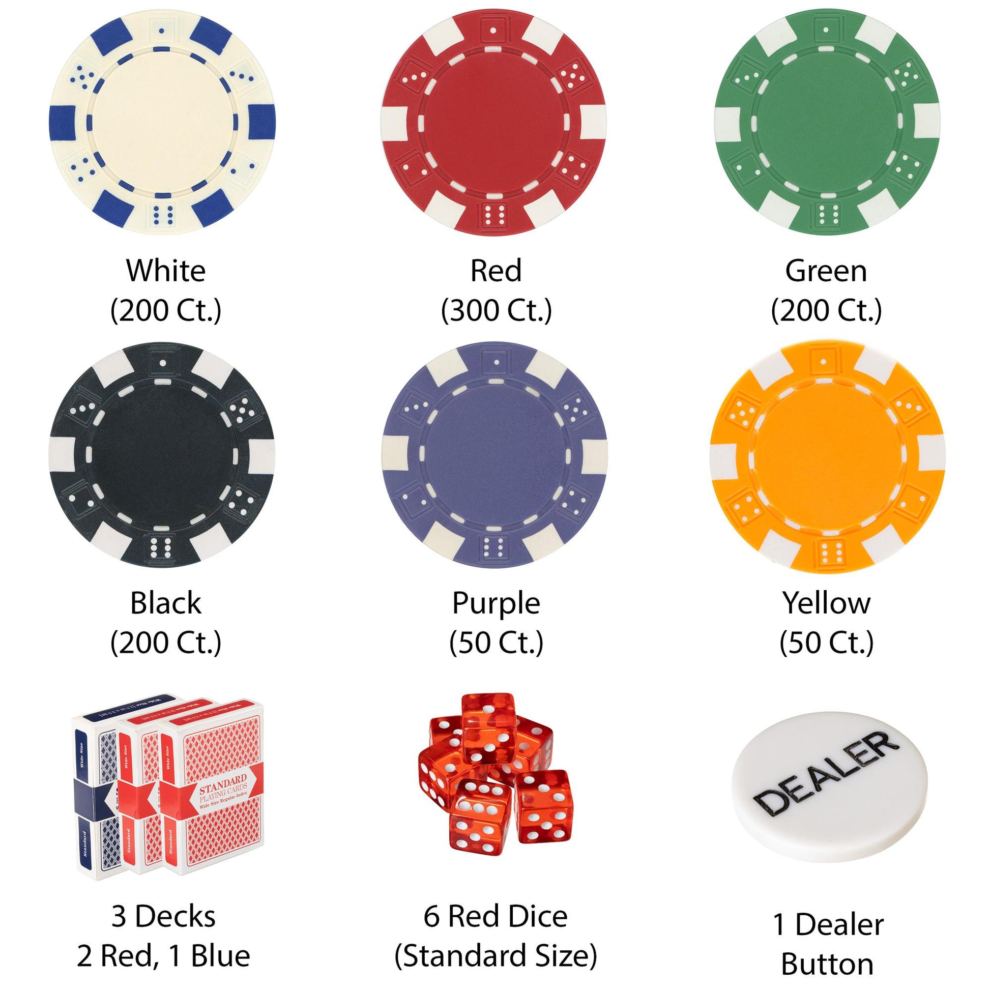 In this set you get 200 white chips, 300 red chips, 200 green chips, 200 black chips, 50 purple chips, and 50 orange chips.