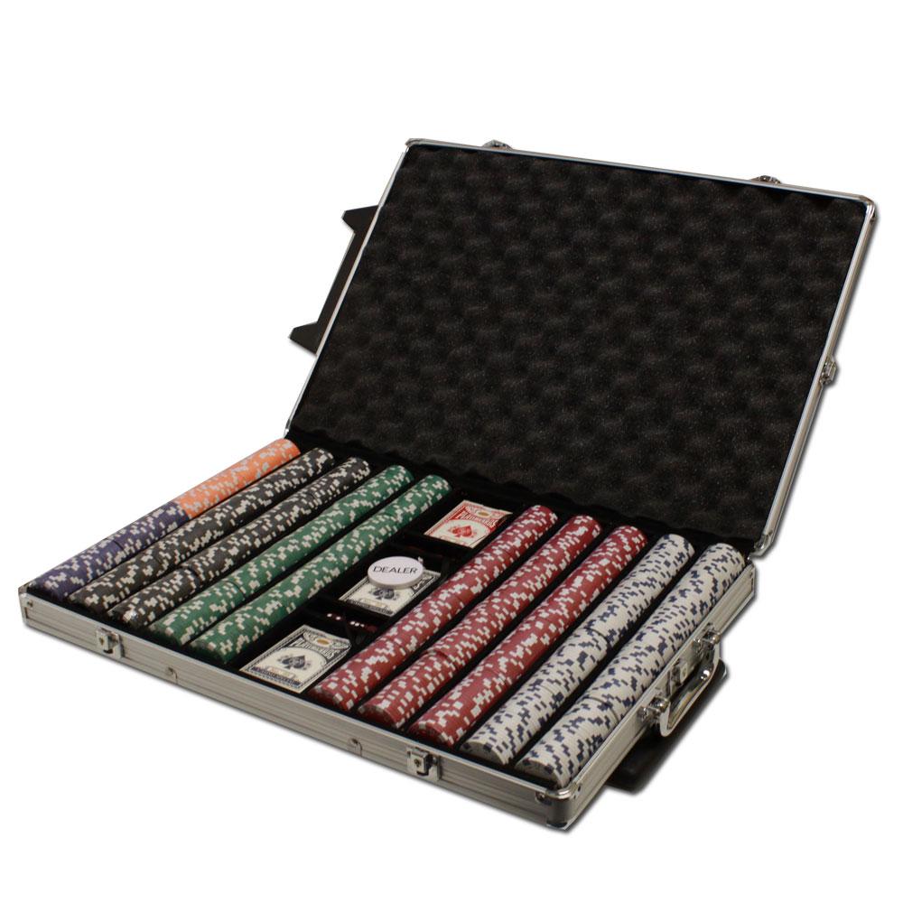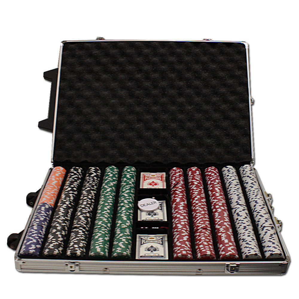 This is the 1000 piece Striped Dice 11.5 gram poker chip set with a rolling aluminum case. This set includes 1000 of the clay-composite Striped Dice poker chips, a dealer button, 6 dice and 3 decks of playing cards .
