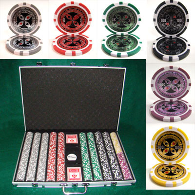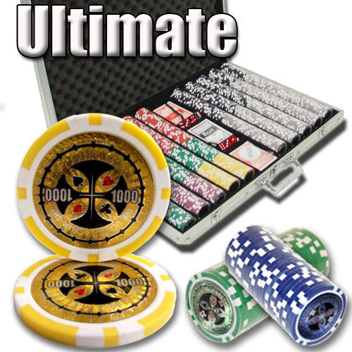 This is the 1000 piece Ultimate 14 gram poker chip set with an aluminum case. This set includes 1000 of the clay-composite Ultimate poker chips, a dealer button, 5 dice and 3 decks of playing cards .