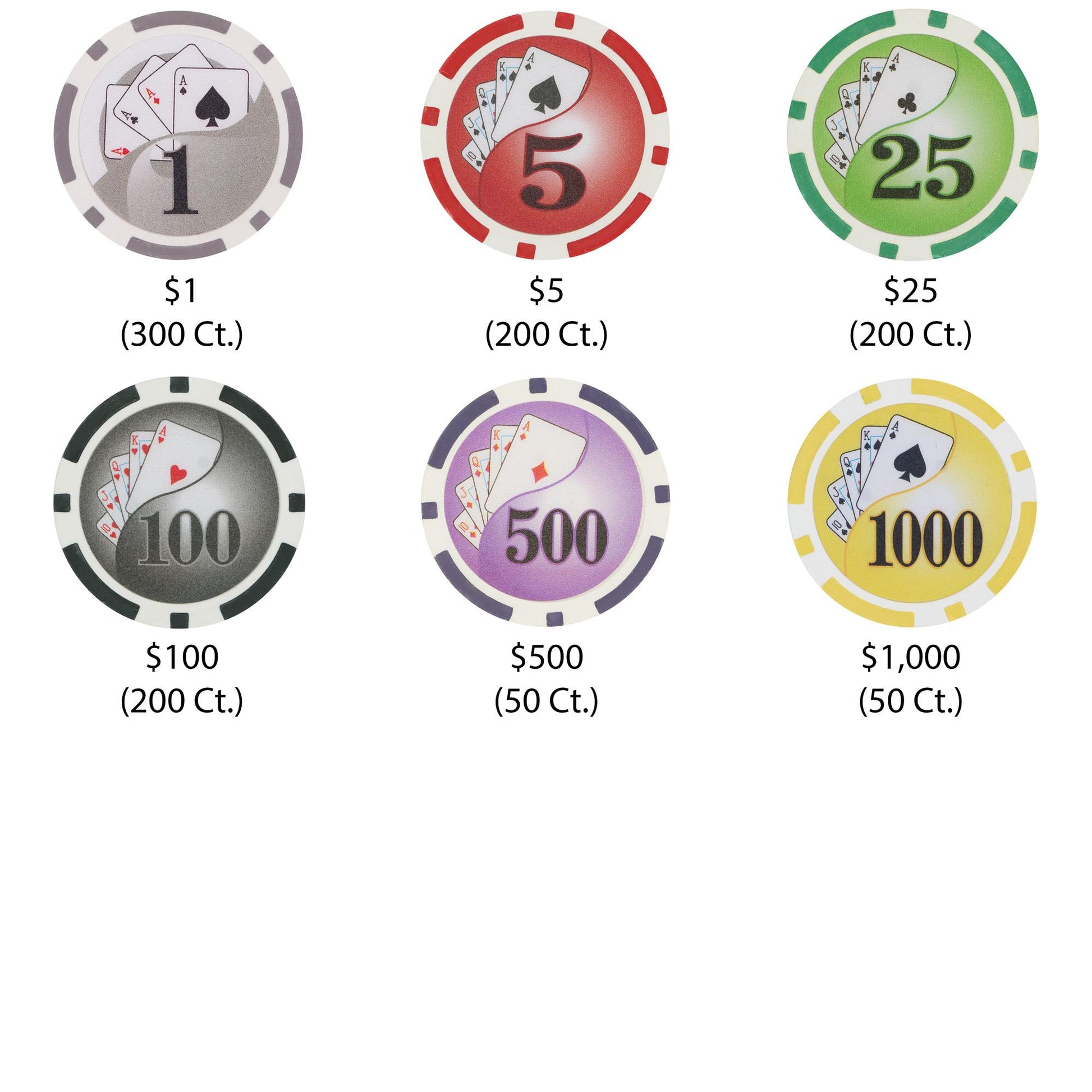 In the standard set you get 300 white $1 chips, 200 red $5 chips, 200 green $25 chips, 200 black $100 chips, 50 purple $500 chips, and 50 yellow $1000 chips.