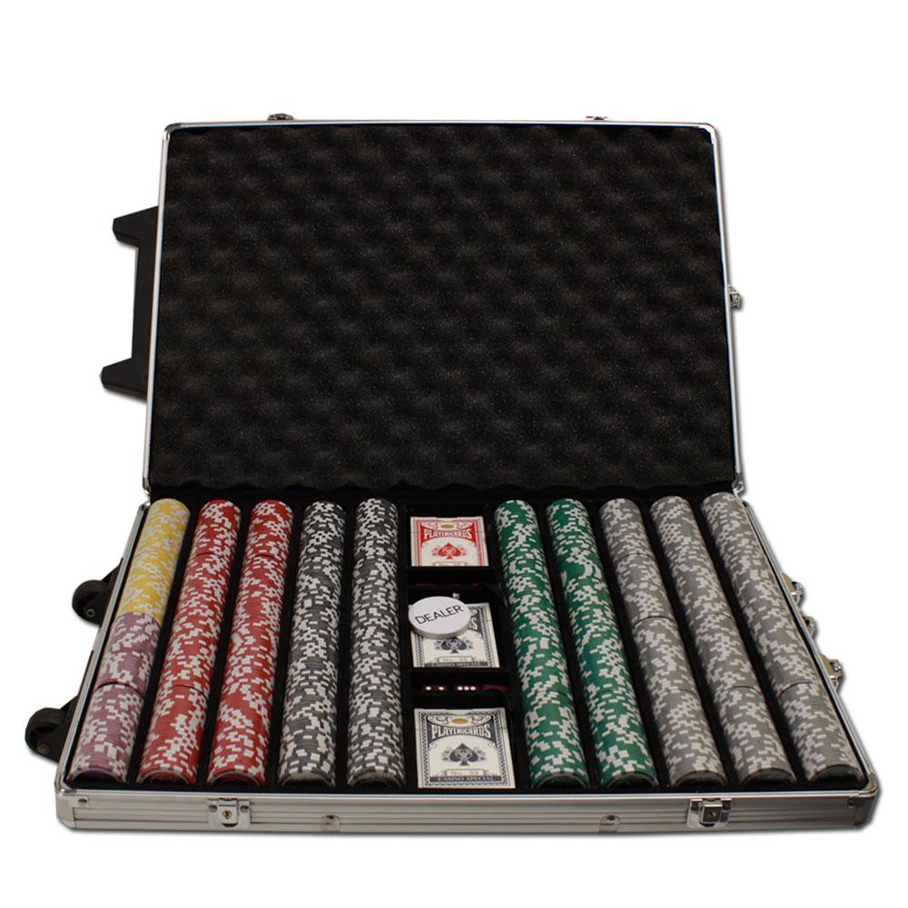 This is the 1000 piece Yin Yang 13.5 gram poker chip set with a rolling aluminum case. This set includes 1000 of the clay-composite Yin Yang poker chips, a dealer button, 6 dice and 3 decks of playing cards .