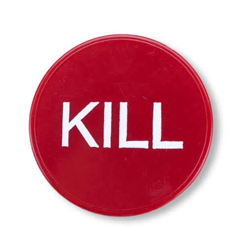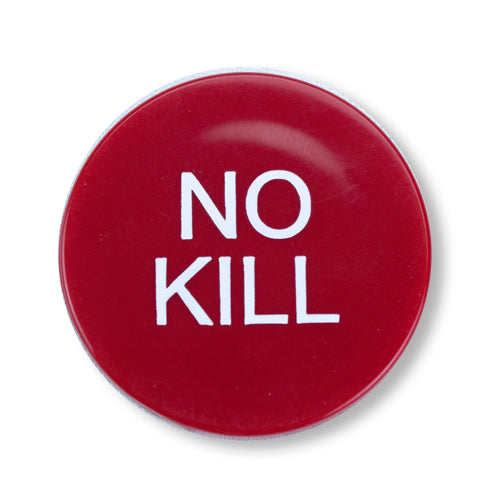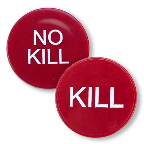 This reversible button is red and the word "Kill" is stamped in white lettering on one side and the words "No Kill" are stamped in white lettering on the other side.