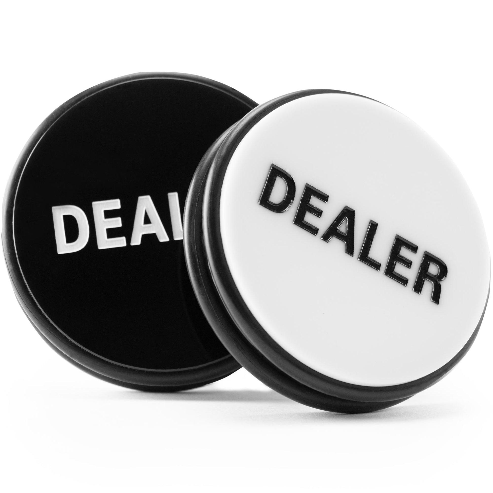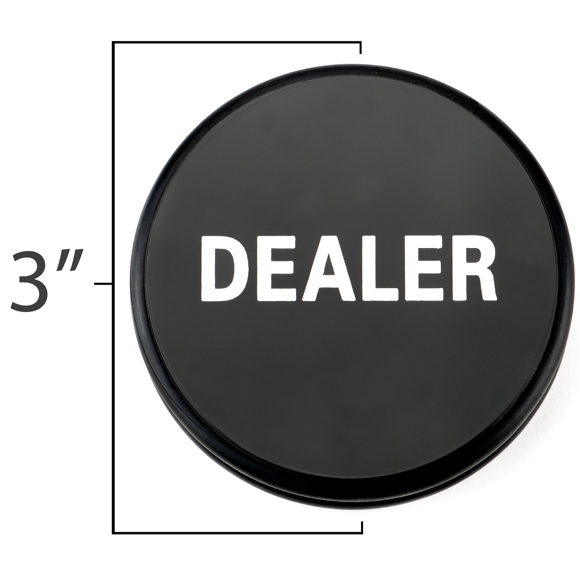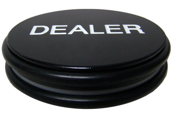 This is a very high quality dealer button. Sturdy and attractive acrylic, it is protected with rubber bumpers on the sides. DEALER is carved in dark letters into the white acrylic, and with white letters into the dark acrylic on the reverse side. This high quality puck makes any game seem professional. Diameter: 3". Height: 3/4".