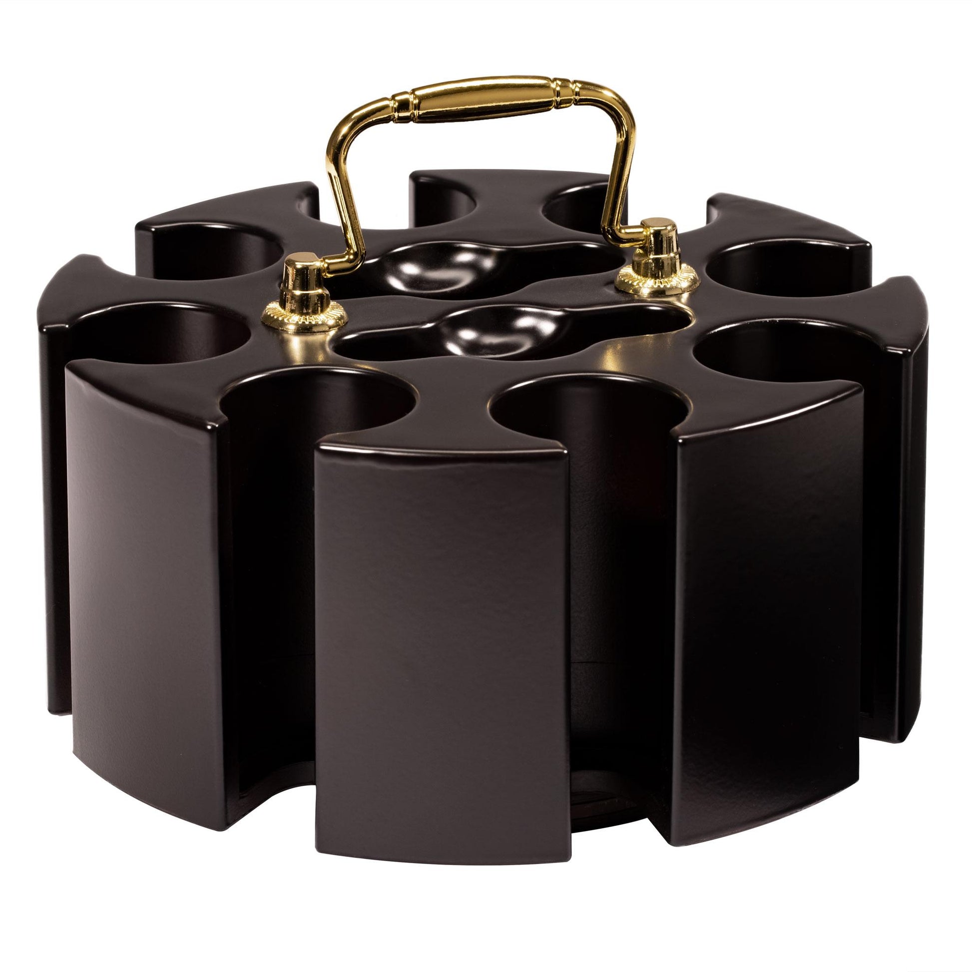 This is the 200 piece Scroll 10 gram poker chip set with a wooden carousel. This set includes 200 of the ceramic Scroll poker chips and 2 decks of playing cards.