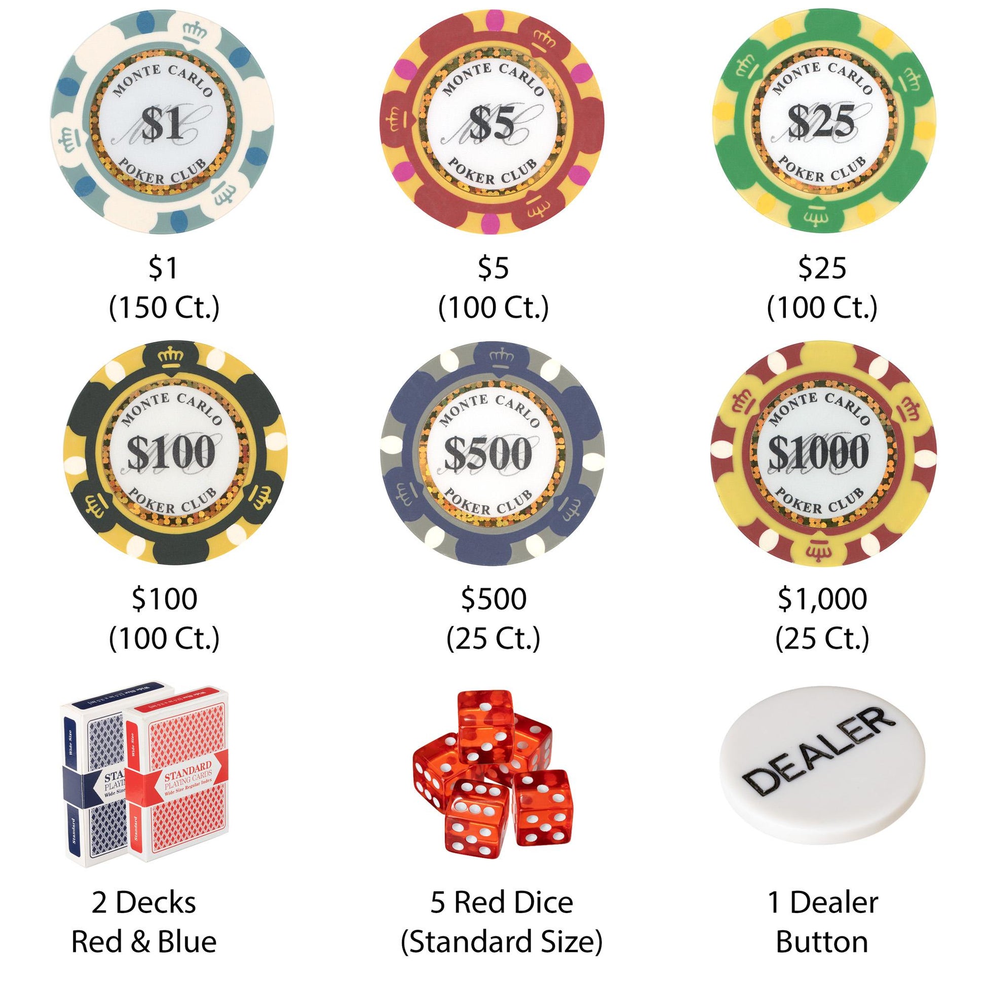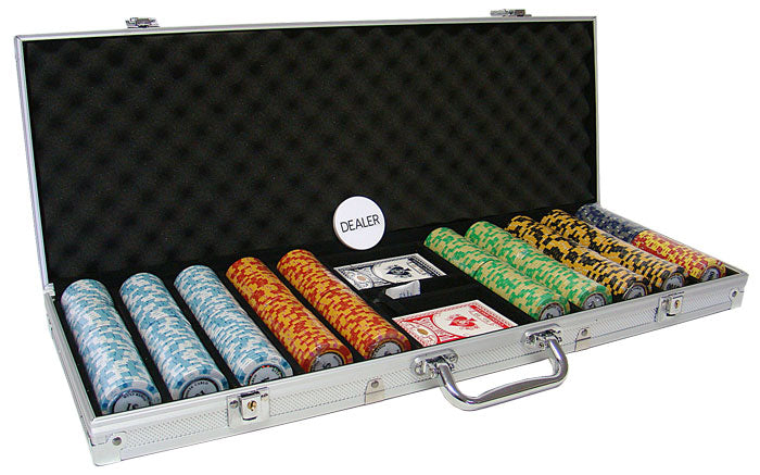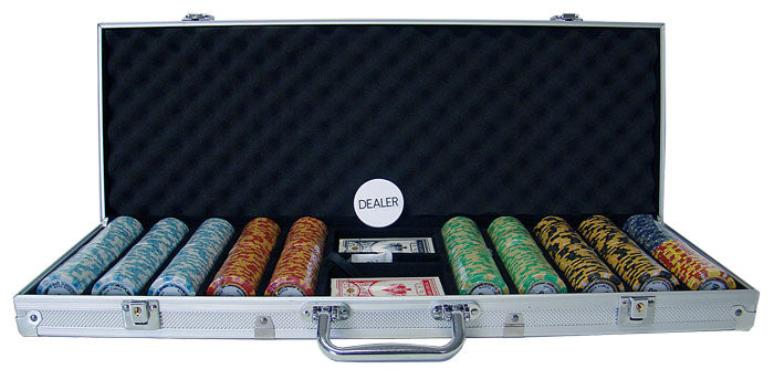 This is the 500 piece Monte Carlo 14 gram poker chip set with an aluminum case. This set includes 500 of the clay-composite Monte Carlo poker chips, a dealer button, 5 dice and 2 decks of playing cards.