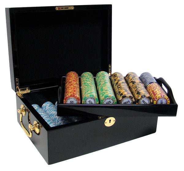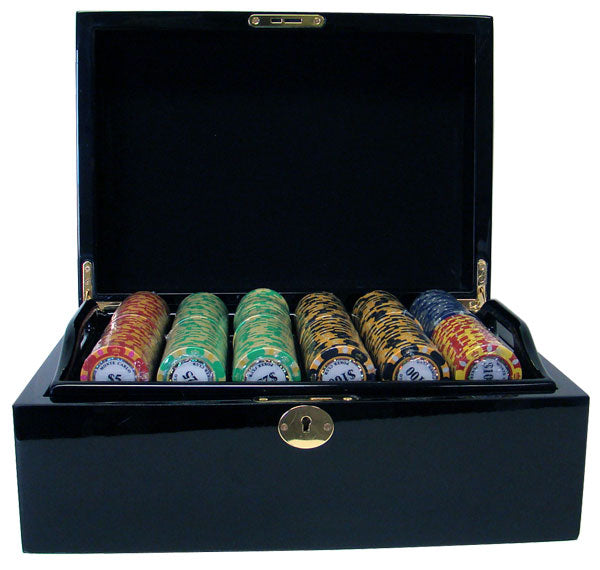 This is the 500 piece Monte Carlo 14 gram poker chip set with a black mahogany case. This set includes 500 of the clay-composite Monte Carlo poker chips, a dealer button, 5 dice and 2 decks of playing cards.