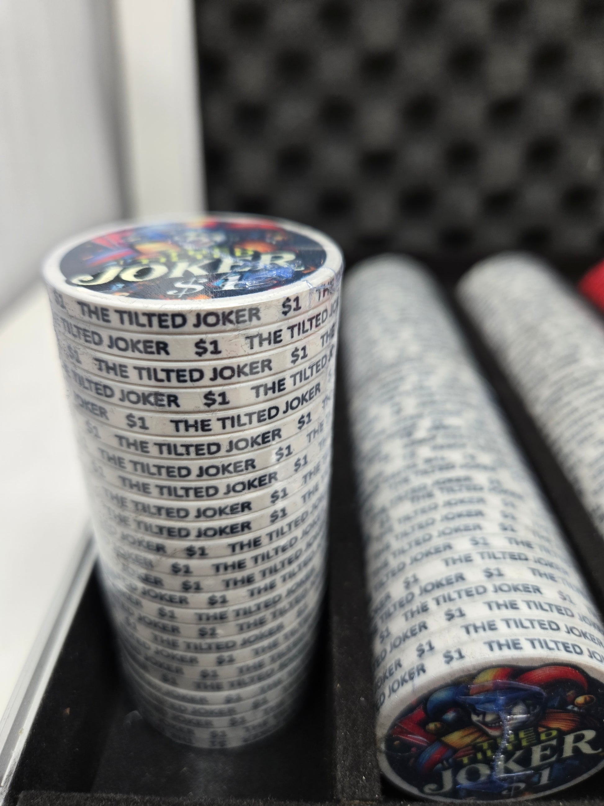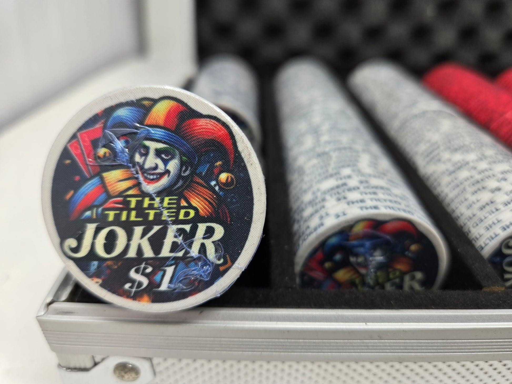 This is the 500 Tilted Joker Ceramic 10 gram poker chip set with a aluminum carrier. This set includes 500 of the ceramic Tilted Joker poker chips, a Ceramic Oversize dealer button and more!
