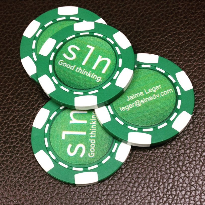 Are you looking for one of the highest quality custom chips on the market today? Look no further, the 6 Stripe Custom Poker Chips have arrived! With our revolutionary printing process, we print your logo, image or text right on the poker chip. You never have to worry about a sticker peeling off, ever. These are our most popular option for company events, golf markers, or other special occasions.
