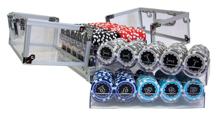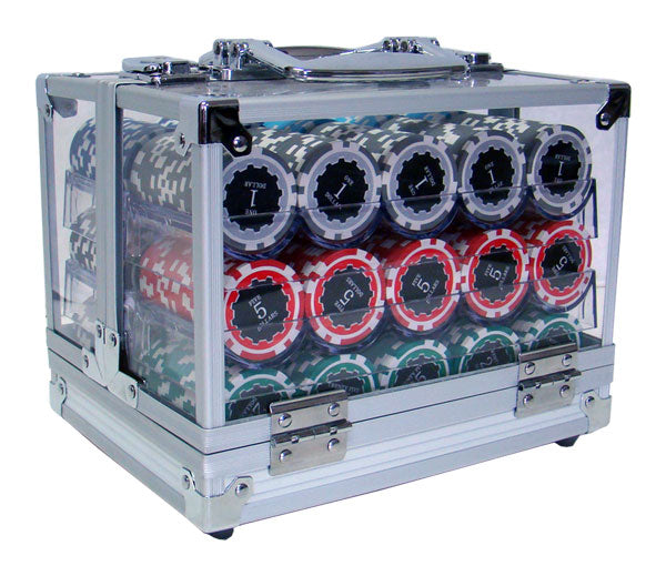 This is the 600 piece Eclipse 14 gram poker chip set with an acrylic carrier. This set includes 600 of the clay-composite Eclipse poker chips and six acrylic chip trays.