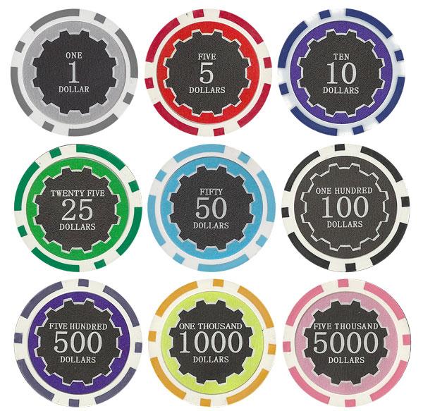 In this set you get 100 white $1 chips, 100 red $5 chips, 50 dark blue $10 chips, 100 green $25 chips, 50 light blue $50 chips, 100 black $100 chips, 50 purple $500 chips, 25 yellow $1000 chips, and 25 pink $5000 chips.