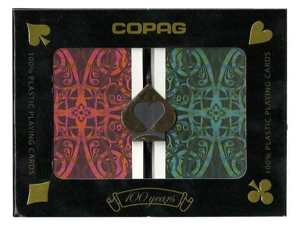 Don't miss the high quality Copag Aldrava Poker Playing Cards. These all plastic cards are bridge size (2.25" x 3.5") and have a jumbo index. With this set you receive one red-shade deck and one blue-shade deck.