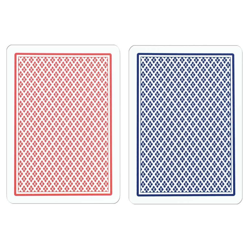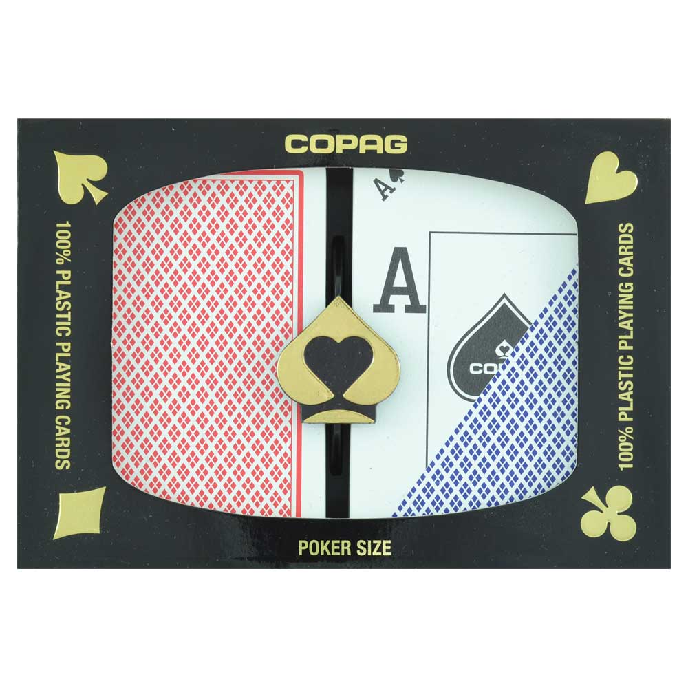 These cards are 100% plastic for increase durability. Like other Copag cards they are scuff and scratch resistant to eliminate accidental marking. Each set comes with one blue and one red deck and a plastic holder for protection when you are not using them.