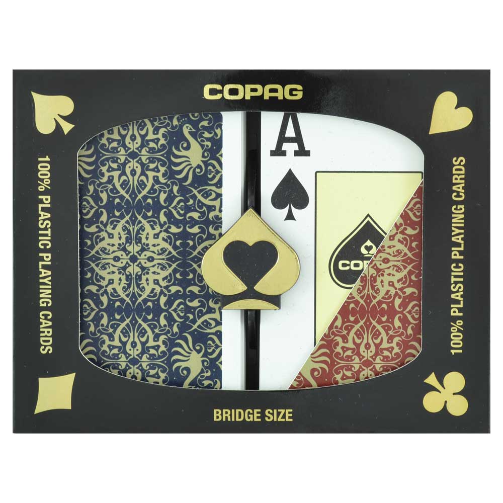 Who needs a script when you have the Copag Script Playing Cards. These high quality complete plastic cards are bridge size with a jumbo index. When you get this amazing set you get one red deck and one blue deck for all those poker moods.