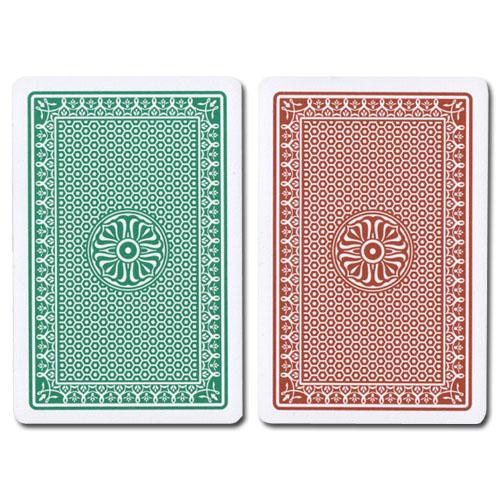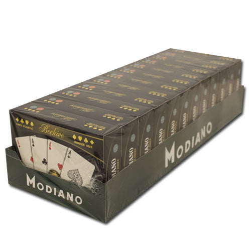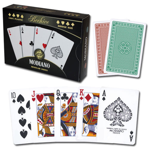This set of 100% Plastic Bridge Size (2.25" x 3.5") Regular Index Beehive Modiano cards includes one Green deck of Poker Club Series cards, one Brown deck of Beehive Series cards, and a protective plastic case.