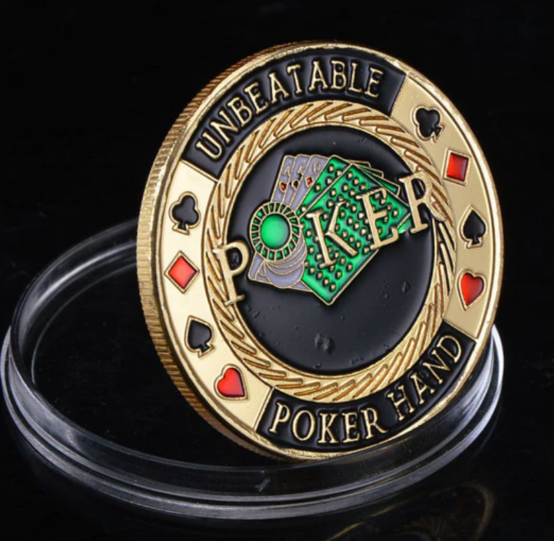The Unbeatable Poker Hand card guard is an individually hand-painted shiny brass coin. Quality sturdy design.